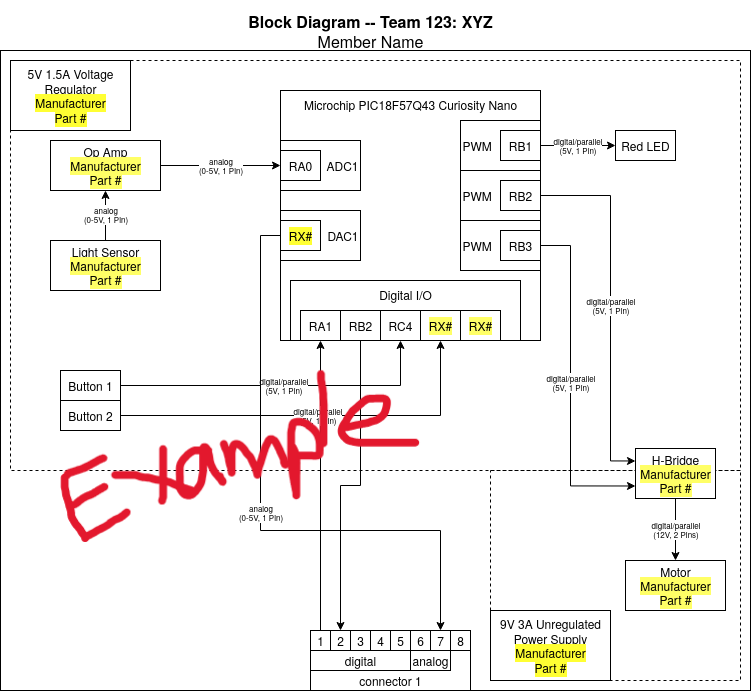 This needs to be updated with a brief purpose for having the block diagram. Things to mention are: * power levels * sensor * Actuator * team connections * Power source * ...